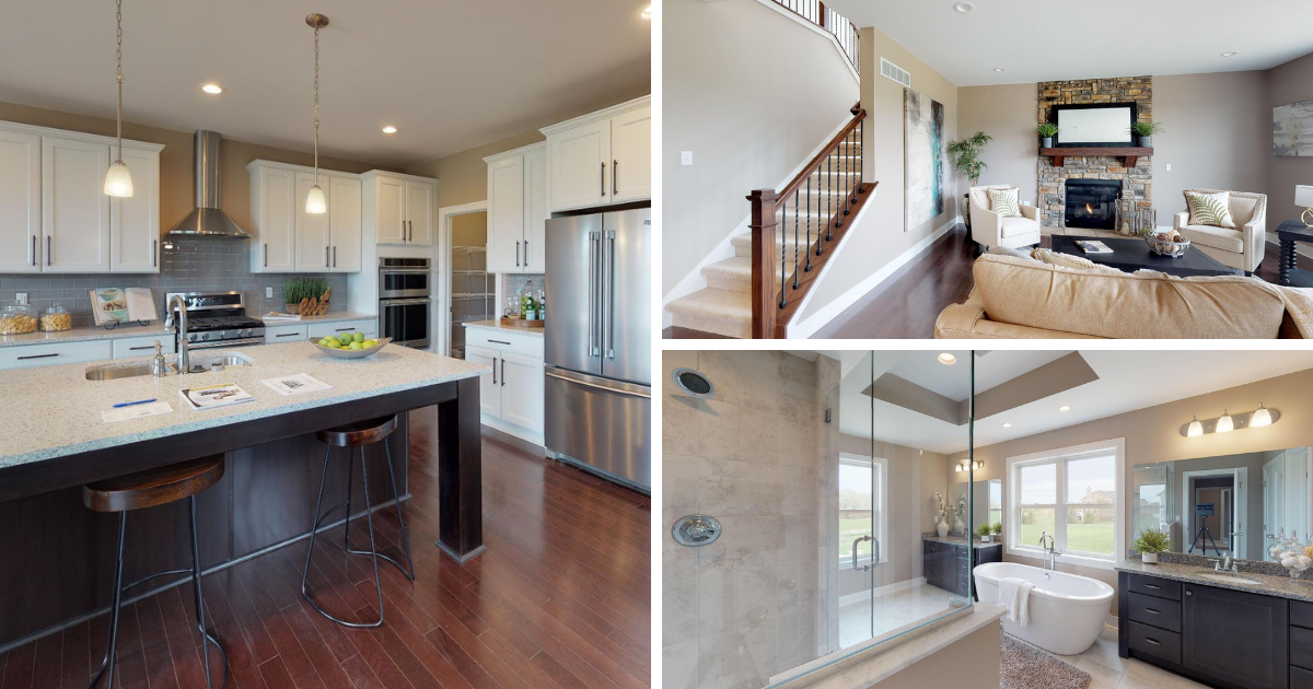 Priced at $739,900, The Hampton floor plan is represented here, created by the acclaimed TR Design Group of Bloomfield Hills. The 3,129-square-foot residence offers 4 bedrooms and 3.5 baths. The open floor plan on the first floor is bright and sunny, thanks to the many windows that also provide a panoramic view of the surrounding landscape. The fireplace in the living room features a custom stone surround that creates an inviting focal point. The added warmth of hardwood floor is a rich accent to the main living area.